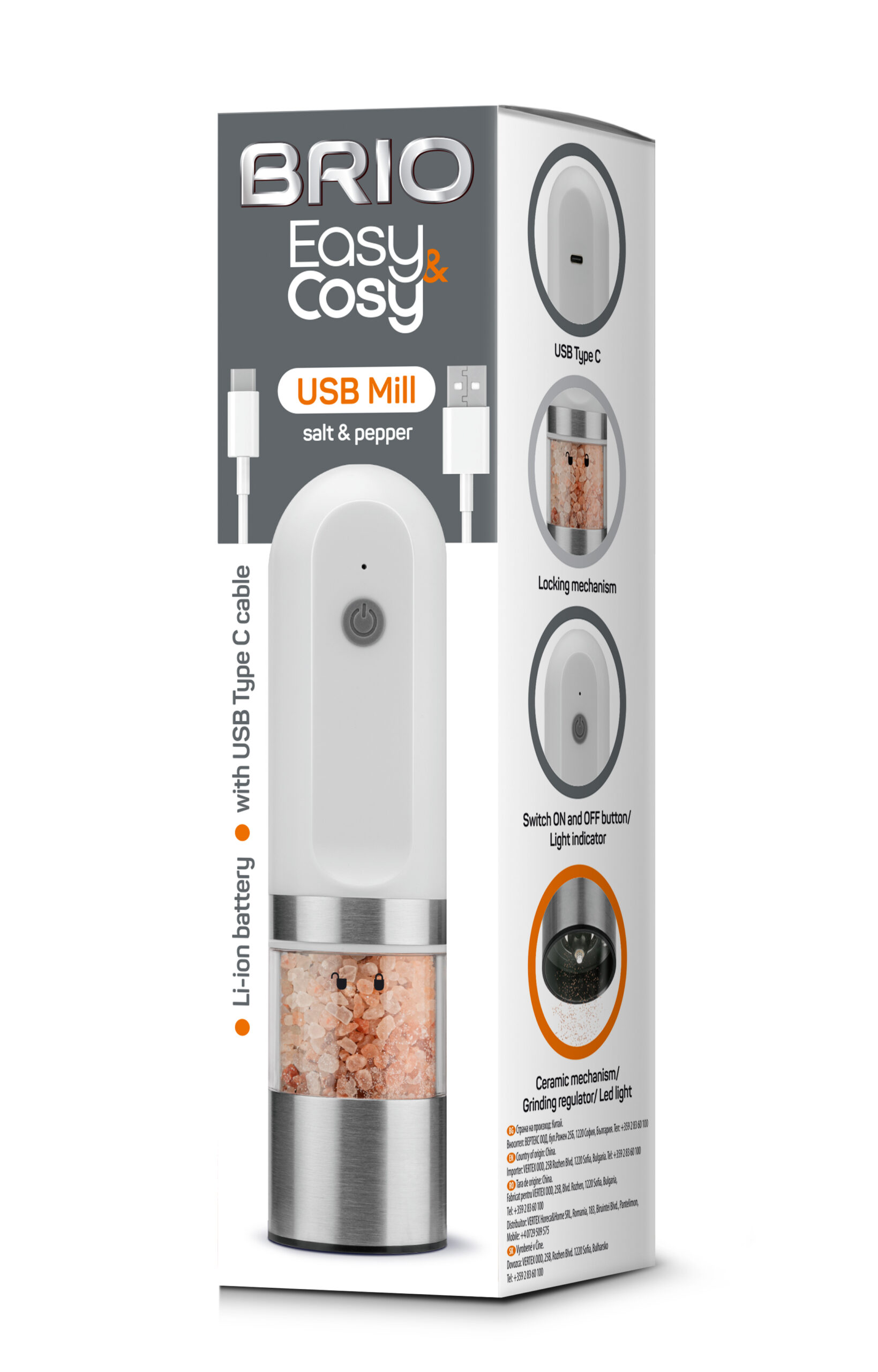 BRIO EASY COSY – Rasnita electrica sare/piper, incarcare USB- Alb -5.2х19.5 cm (12)
